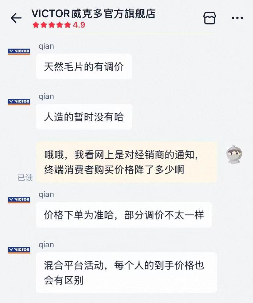 不少羽毛球爱好者近日发现,持续走高的羽毛球价格迎来理性回归,威克多、亚狮龙等多个主流品牌相继发布降价通知,终端市场价格同步松动,结束了去年一年三次涨价的态势。