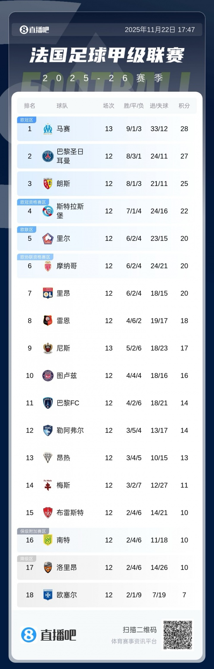 欧塞尔本赛季法甲目前12轮积7分,目前在法甲积分榜垫底。